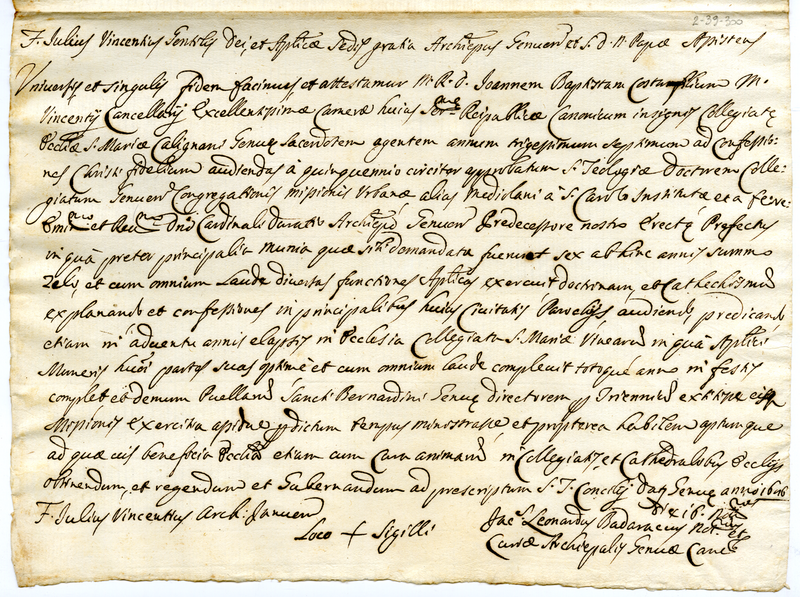 Attestato dell'ercivescovo di Genova Giulio Vincenzo Gentile a favore del sacerdote Giovanni Battista Costa (1686 novembre 16)