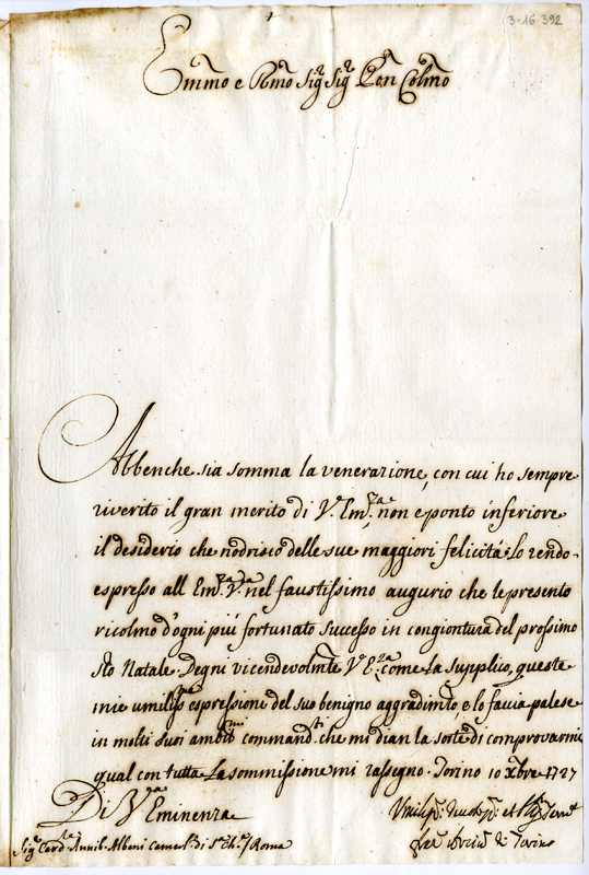 Lettera dell'arcivescovo di Torino al cardinale Annibale Albani (1727 dicembre 10)
