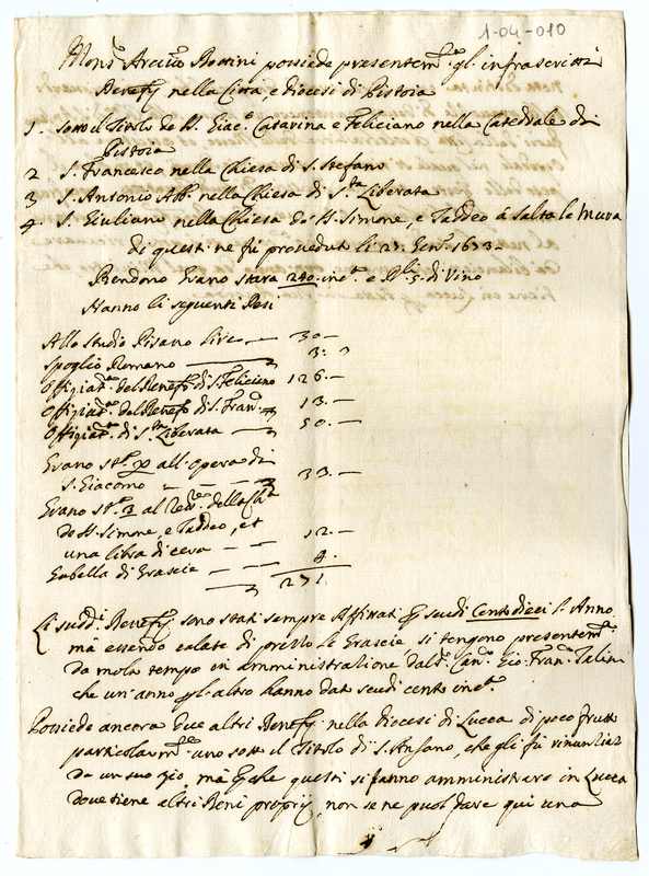 Benefici dell'arcivescovo Bottini nella diocesi di Pistoia.