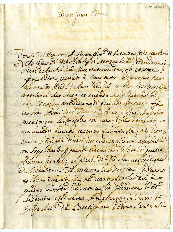 Lettera del conte Tommaso del Pane a papa Clemente XI (1700-1721)
