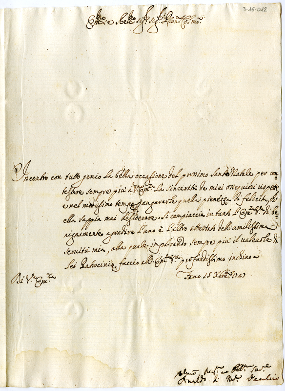 Lettera di Rinaldo di Monte Vecchio al cardinale Annibale Albani (1727 dicembre 15)