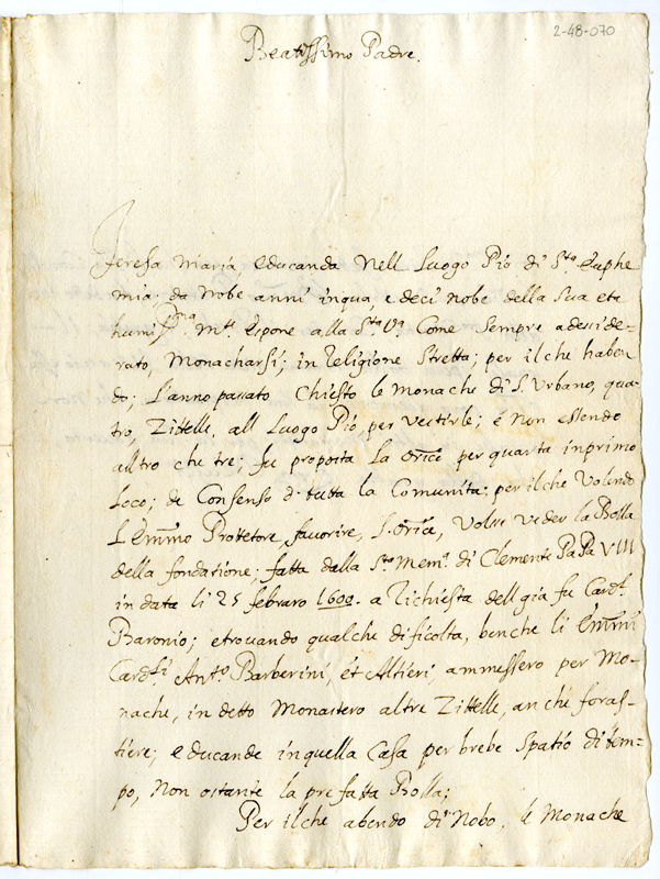 Lettera di Teresa Maria educanda nel luogo Pio di Santa Eufemia a papa Clemente XI (1700-1721)