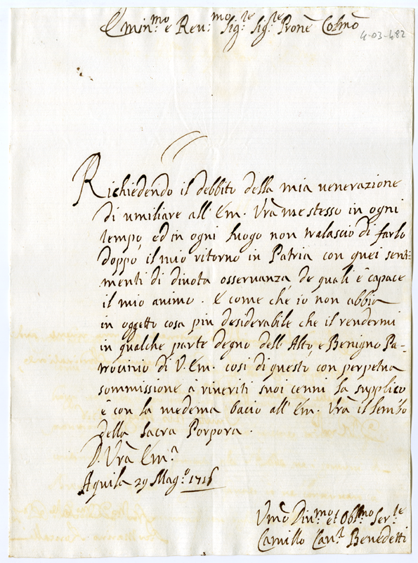 Lettera di Camillo Benedetti al Cardinale Annibale Albani (1716 maggio 29)