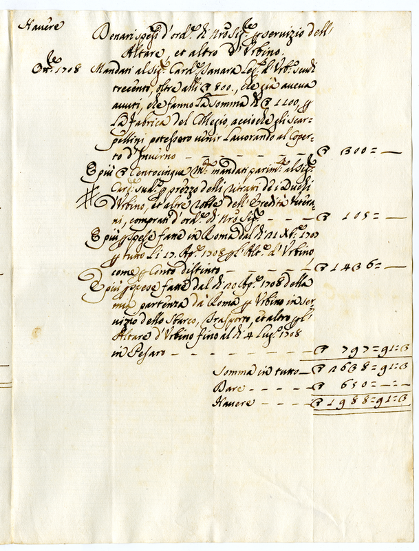 Memorie delle spese fatte dal Sommo Pontefice Clemente XI per il nobilissimo altare maggiore della chiesa Metropolitana d'Urbino sotto il quale riposa il corpo di san Crescentino Martire Protettore della stessa città. Dare, havere (1708)
