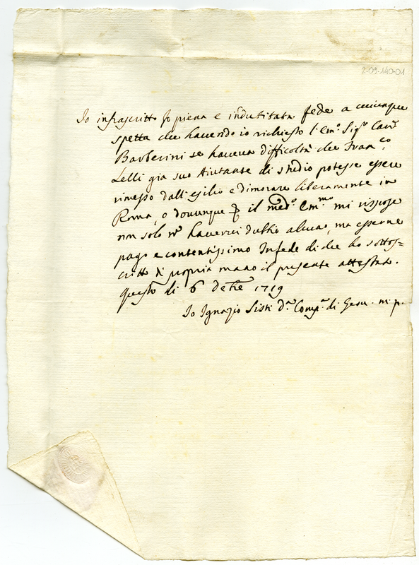 Attestato rilasciato in favore di Francesco Lelli da parte del cardinale Barberini (1719 dicembre 6)