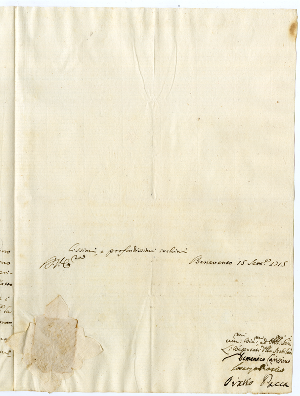 Lettera dei deputati della nobiltà di Benevento Domenico Carissimo, Lorenzo Roscio, Orazio Pacca al Cardinale Annibale Albani (1715 settembre 15)