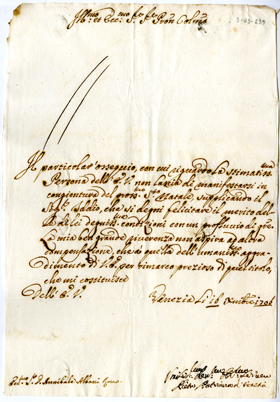 Lettera di Pietro patriarca di Venezia ad Annibale Albani (1706 dcembre 16)