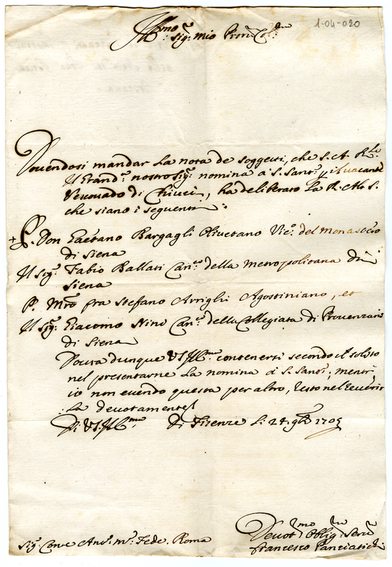 Nominativi dei soggetti nominati dal Gran Duca di Toscana per la vacante chiesa di Chiusi.