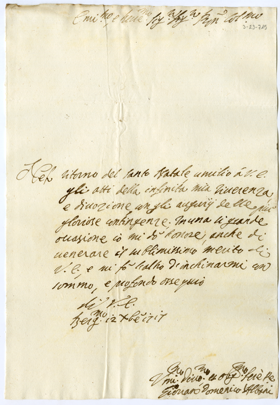 Lettera di Giovan Domenico Albani al cardinale Annibale Albani (1717 dicembre 12)