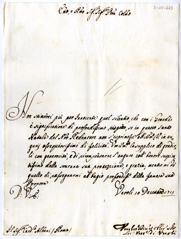 Lettera di Lorenzo vescovo di Veroli al cardinale Annibale Albani (1715 dicembre 10)