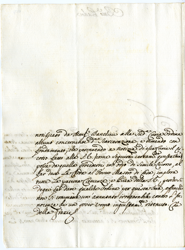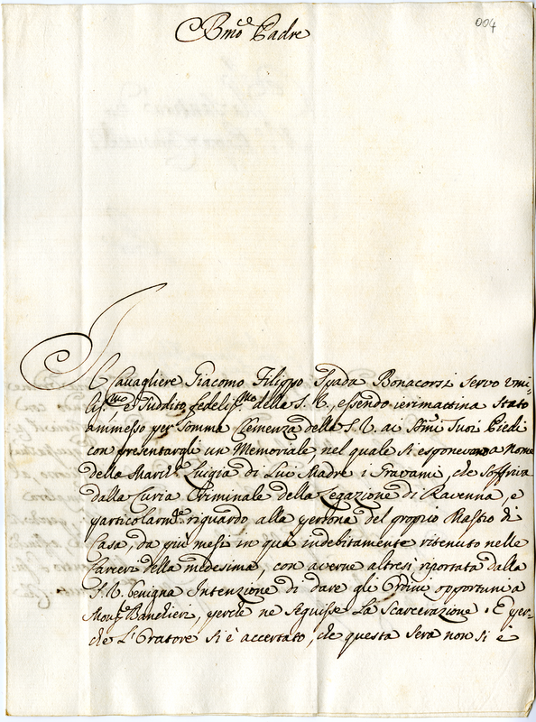 Il cavaliere Giacomo Filippo Spada Bonaccorsi chiede a nome di sua madre Luigia la liberazione del maestro di casa ingiustamente incarcerato a Ravenna