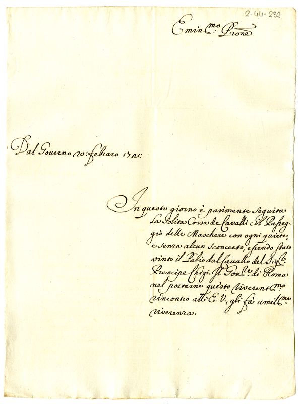 Lettera del governatore ad un cardinale (1721 febbraio 20)