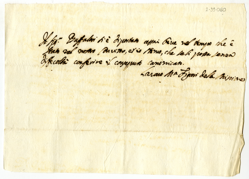 Attestato di Lazzaro Maria Figari prete della Missione a fovore del signor Buffalori, da lui titenuto degno del consaputo canonicato (1700-1721)