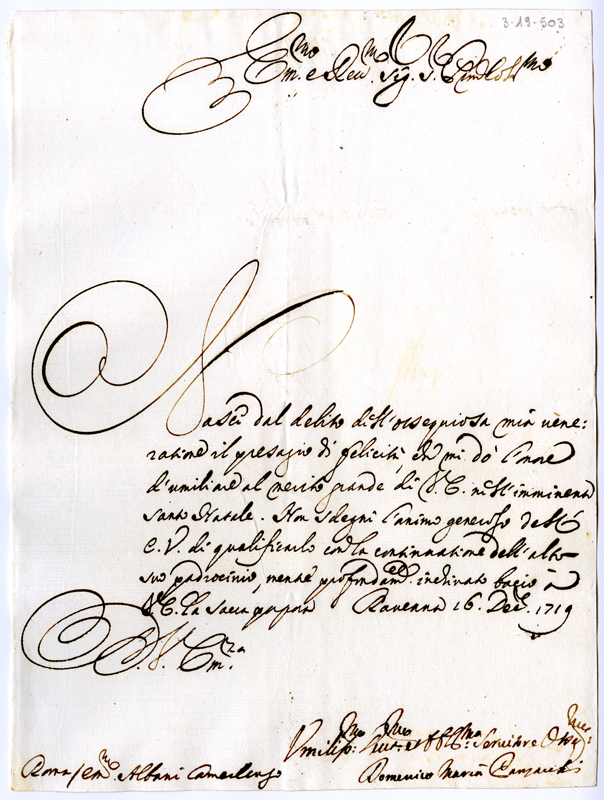 Lettera di Domenico Maria Cansacchi al cardinale Annibale Albani (1719 dicembre 16)