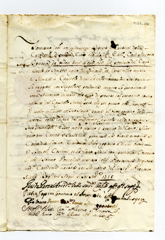 Attestazione di buone qualità del canonico Carlo Antonio Beccaria rilasciata dai canonici della cattedrale di Aqui (1718 settembre 6)