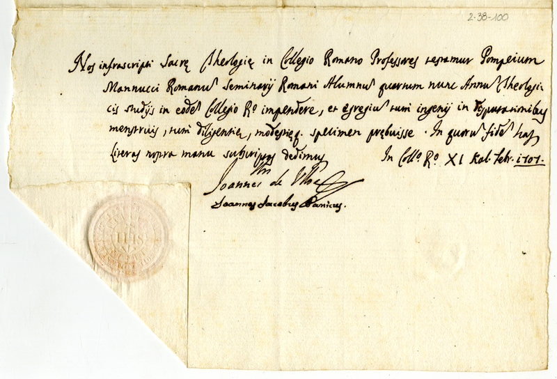 Attestato in favore di Pompeo Mannucci alunno del seminario Romano rilasciato da Giovanni Giacomo Panichi e da Giovanni De Villa (1707 gennaio 22)