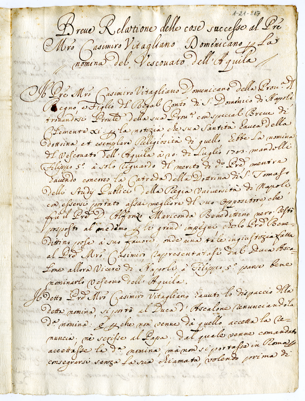 Breve Relattione delle cose successe al Padre Maestro Casimiro Vitagliano Domenicano per la nomina del Vescovato dell'Aquila (1700-1721)