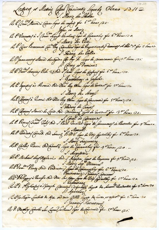 Lettori e materie stabilite per l'anno 1711 sui casi di coscienza in varie chiese (1711)