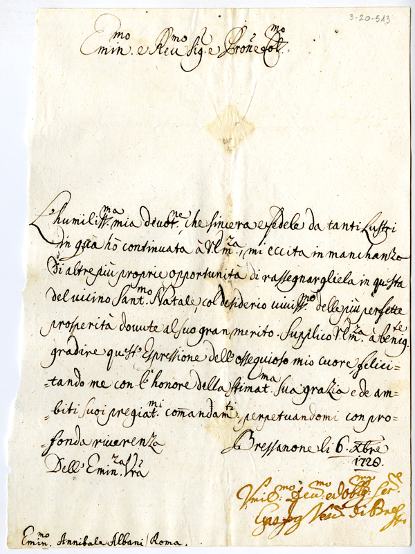 Lettera di Gaspar vescovo di Bressanone al cardinale Annibale Albani (1728 dicembre 6)