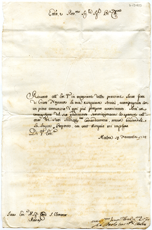 Lettera di fra Paolo vescovo di Malta al cardinale Annibale Albani (1730 novembre 19)