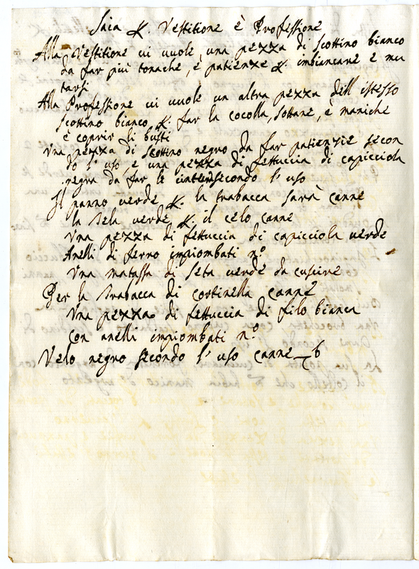 Lista di mobili e biancheria, abiti e suppellettili per una religiosa professa in Santa Susanna (1700-1721)