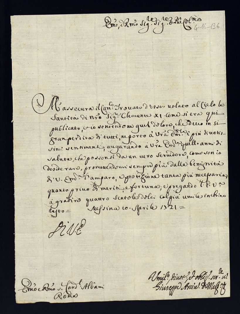 Lettere di condoglianza per la morte di Papa Clemente XI di gloriosa memoria