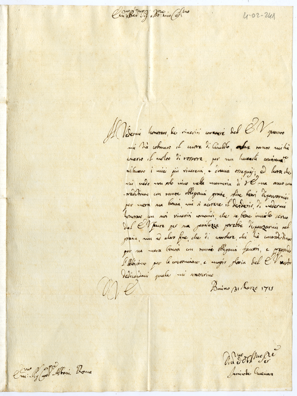 | bo.livello.titolo2 | Archivio Albani|Lettere di complimento, e di Negozio Semestre Primo|"1715 Marzo Tom. I."|Documenti contenuti | |