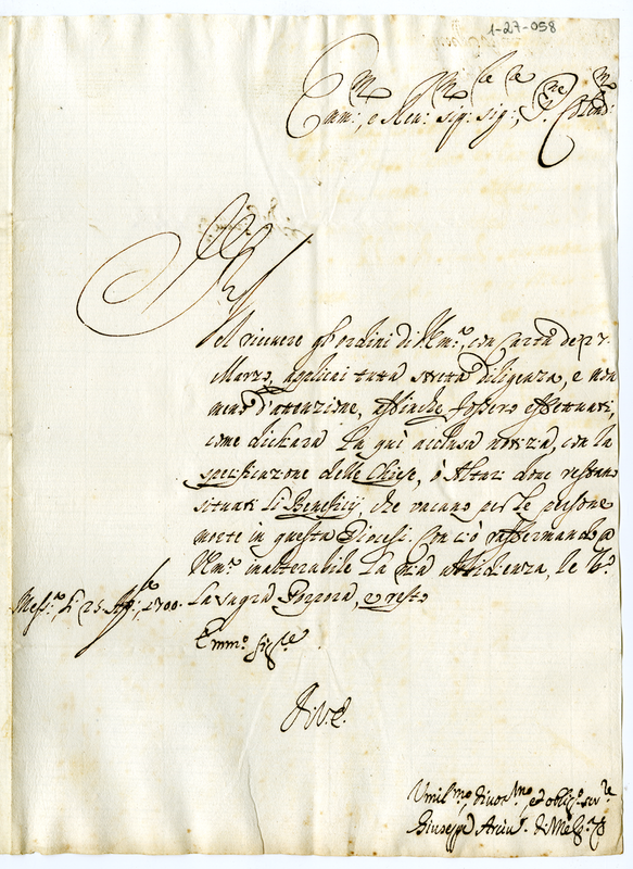Lettera di Giuseppe Arcivescovo di Messina ad un Cardinale (1700 aprile 25)