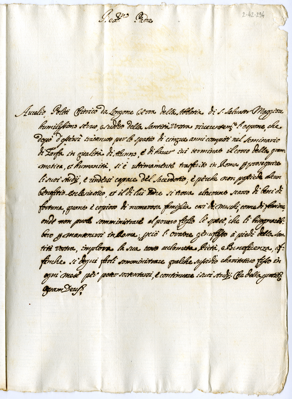 Lettera di Aurelio Politi a papa Innocenzo XII (1691-1700)