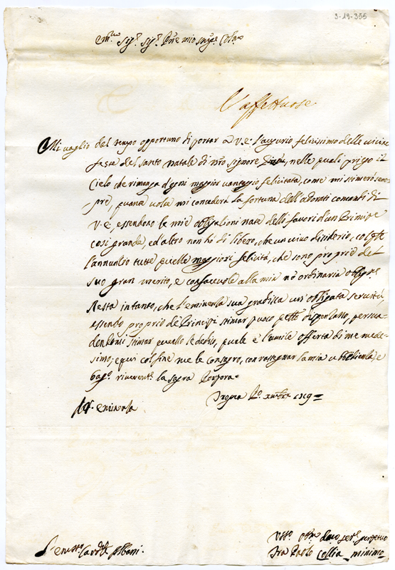 Lettera di fra Paolo Collia minimo al cardinale Annibale Albani (1719 dicembre 1)