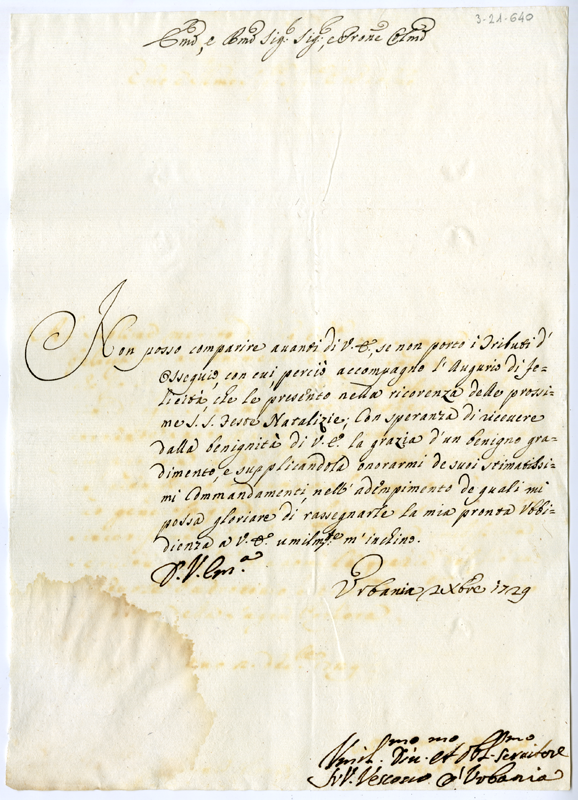 Lettera di Giovanni Vincenzo vescovo di Urbania al cardinale Annibale Albani (1729 dicembre 2)