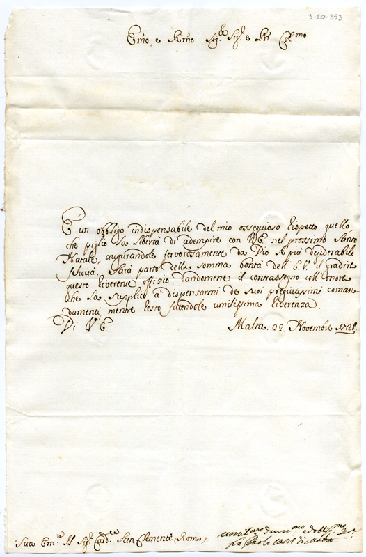 Lettera di Paolo arcivescovo di Malta al cardinale Annibale Albani (1728 novembre 22)