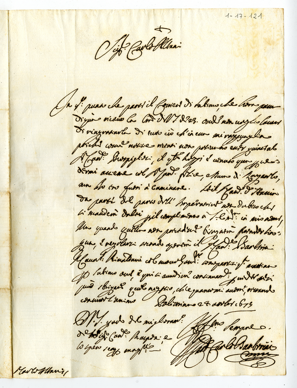 Lettera del cardinale Carlo Barberini a Carlo Albani (1675 ottobre 24)