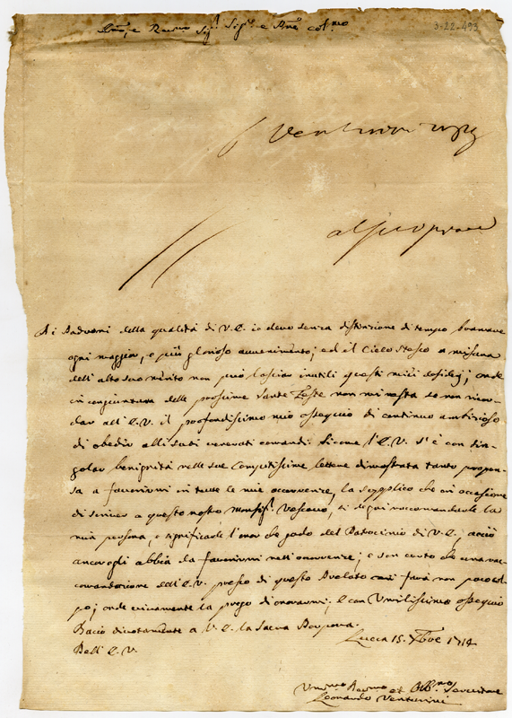 Lettera di Leonardo Venturini al cardinale Annibale Albani (1714 dicembre 15)