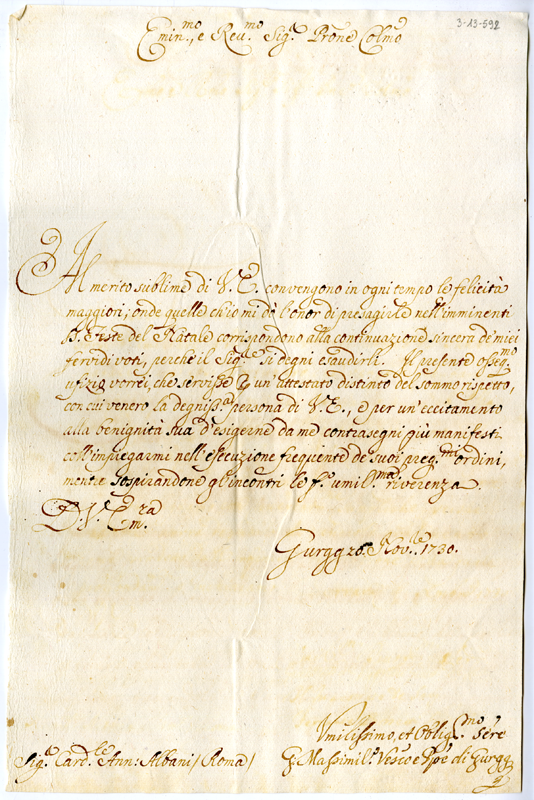 Lettera di Massimiliano vescovo di Gurk al cardinale Annibale Albani (1730 novembre 26)