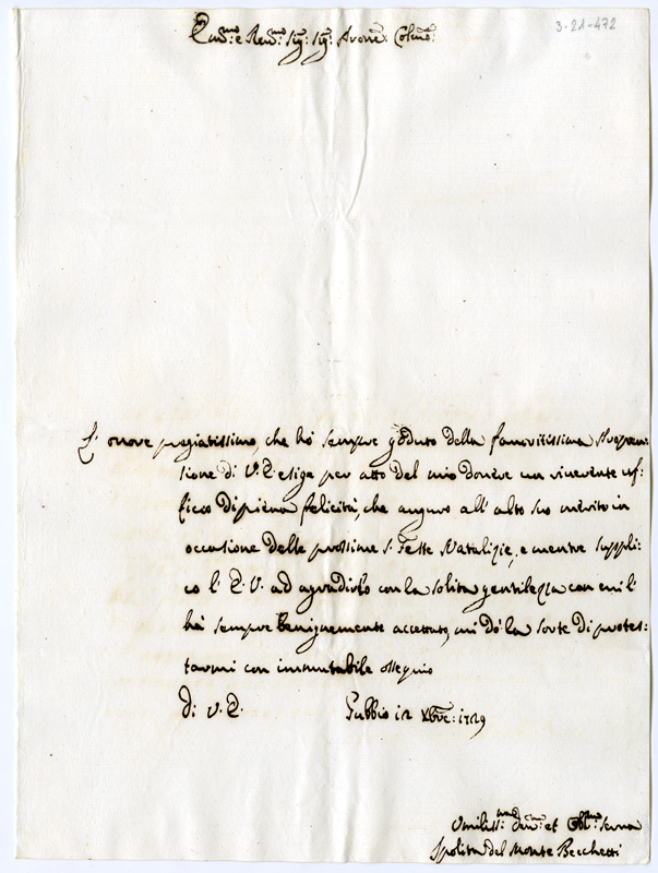 Lettera di Ippolita del Monte Becchetti al cardinale Annibale Albani (1729 dicembre 12)