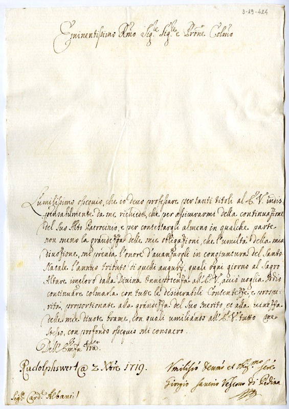 Lettera di Giorgio Saverio vescovo di Pedena al cardinale Annibale Albani (1719 dicembre 2)