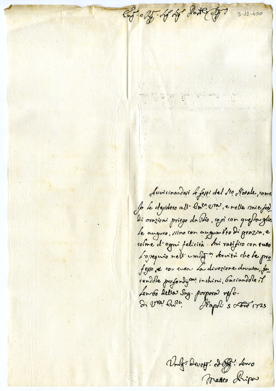 Lettera di Matteo Ripa al cardinale Annibale Albani (1725 dicembre 5)