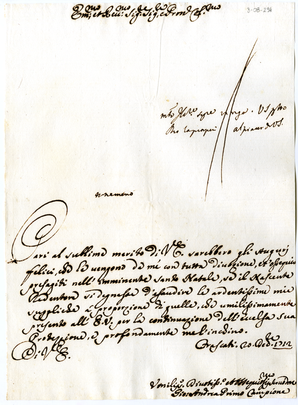 Lettera di Giovanni Andrea Primo Campione al cardinale Annibale Albani (1712 dicembre 20