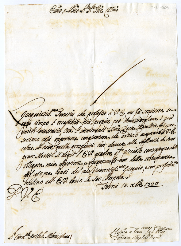 Lettera di Teodoro vescovo di Terni al cardinale Annibale Albani (1723 dicembre 15)