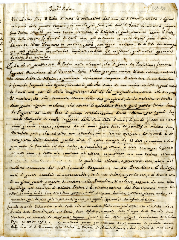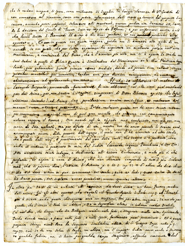 Si manifesta al pontefice la vita licenziosa e indegna di Leonardo Pasquale a cui lo zio Ingrossi Leonardo vorrebbe lasciare la parrocchia. Si prega il pontefice affinchè ciò non avvenga