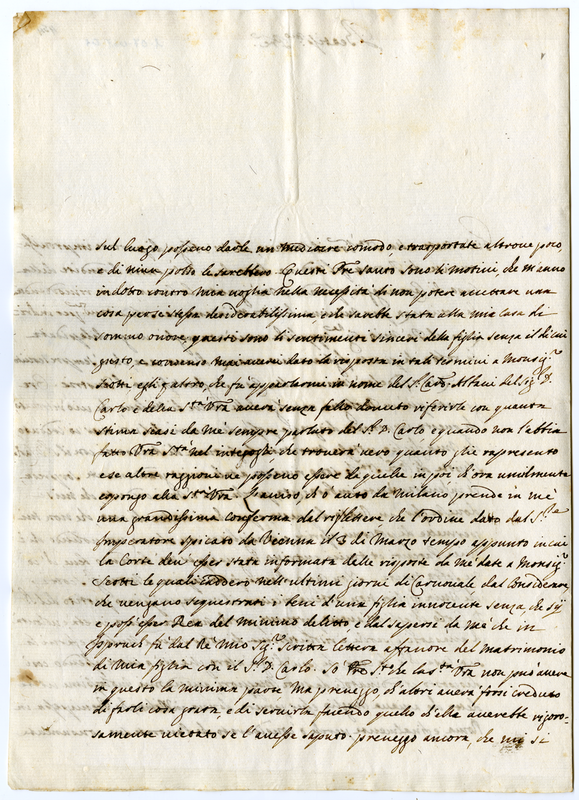 Eleonora Salviati Sforza si lamenta con il pontefice per l'ingiusto prvvedimento preso dall'imperatore d'Austria contro i beni della propria casa a Caravaggio che ritiene essere una ritorsione fatta dalla corte di Vienna per non aver voluto acconsentire alle nozze di sua figlia Bianca Maria con il nipote del papa Carlo Albani