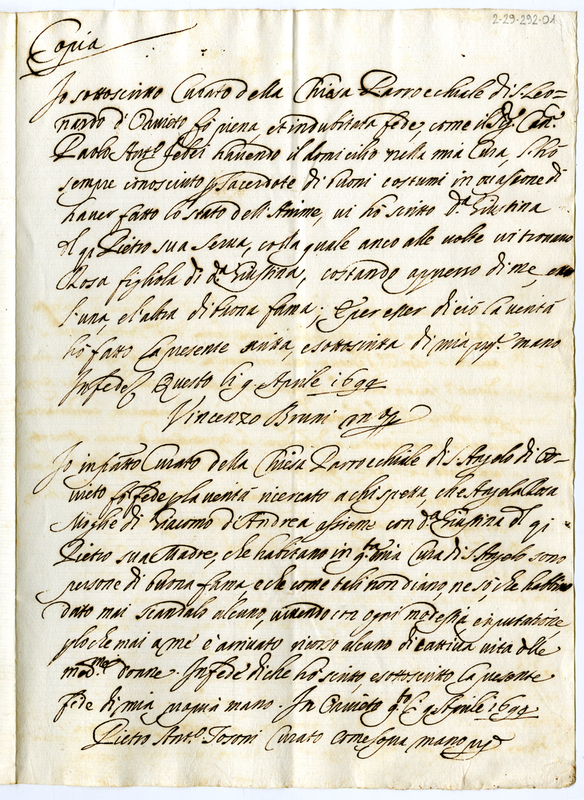 Fede del curato Vincenzo Bruni a favore del sacerdote Paolo Antonio Febei e fede di buoni costumi a favore di Angela Rosa. Copia (1694 aprile 9)