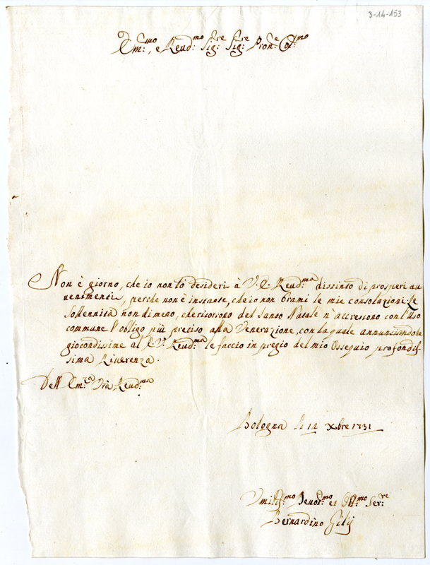 Lettera di Bernardino Gili al cardinale Annibale Albani (1731 dicembre 12)