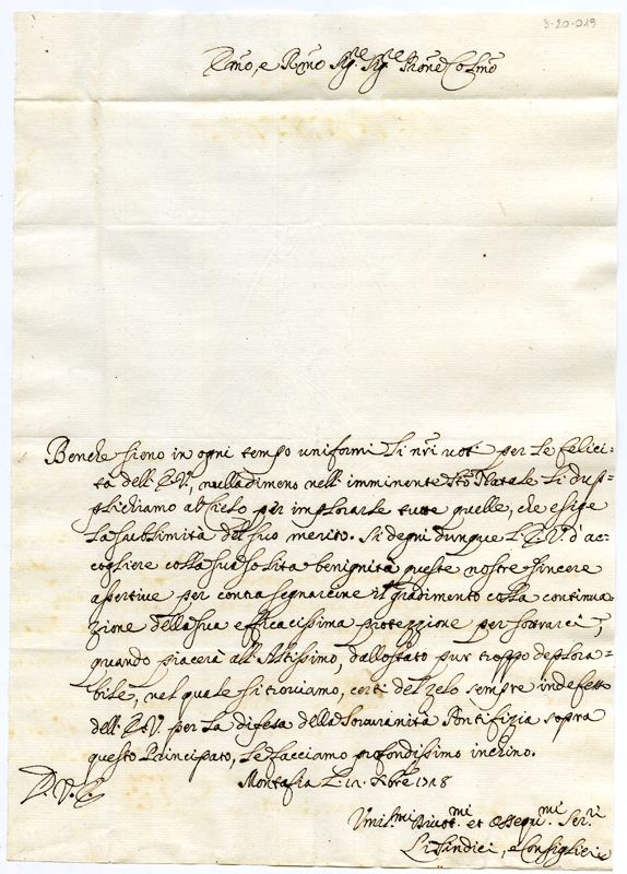 Lettera dei sindaci e consiglieri di Montafia al cardinale Annibale Albani (1728 dicembre 12)