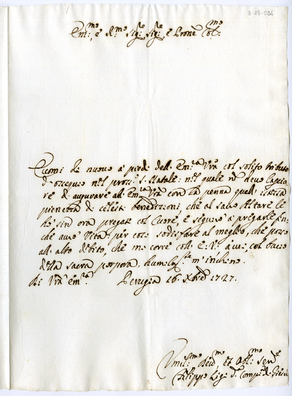 Lettera di Filippo Ligi al cardinale Annibale Albani (1727 dicembre 16)