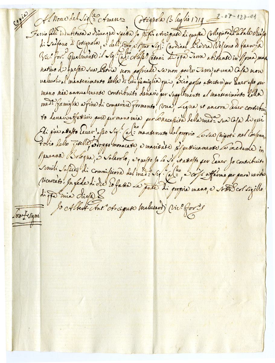 Copia. Attestato dell'arciprete Alberto Antonio Malusardi sulla povertà del capitano Alessandro Catani (1719 luglio 3)