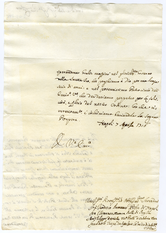 Lettera di Teodosio Romano, Clemente Manca, Filippo Daniele e Paolo Gaspa al Cardinale Annibale Albani (1716 aprile 7)