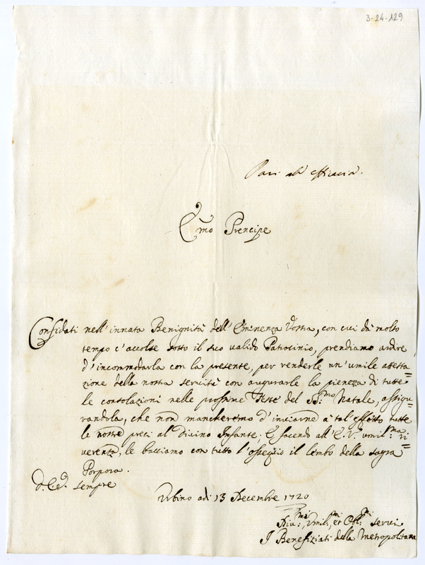 Lettera dei beneficiati della metropolitana di Urbino al cardinale Annibale Albani (1720 dicembre 13)