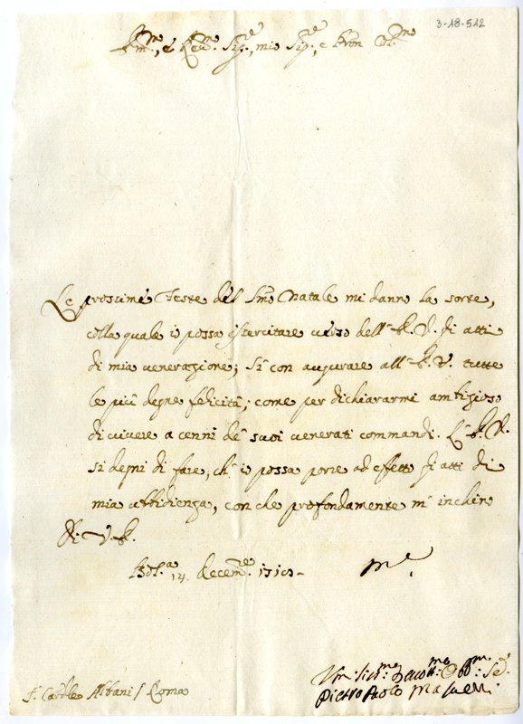 Lettera di Pietro Paolo Malvezzi al cardinale Annibale Albani (1718 dicembre 14)
